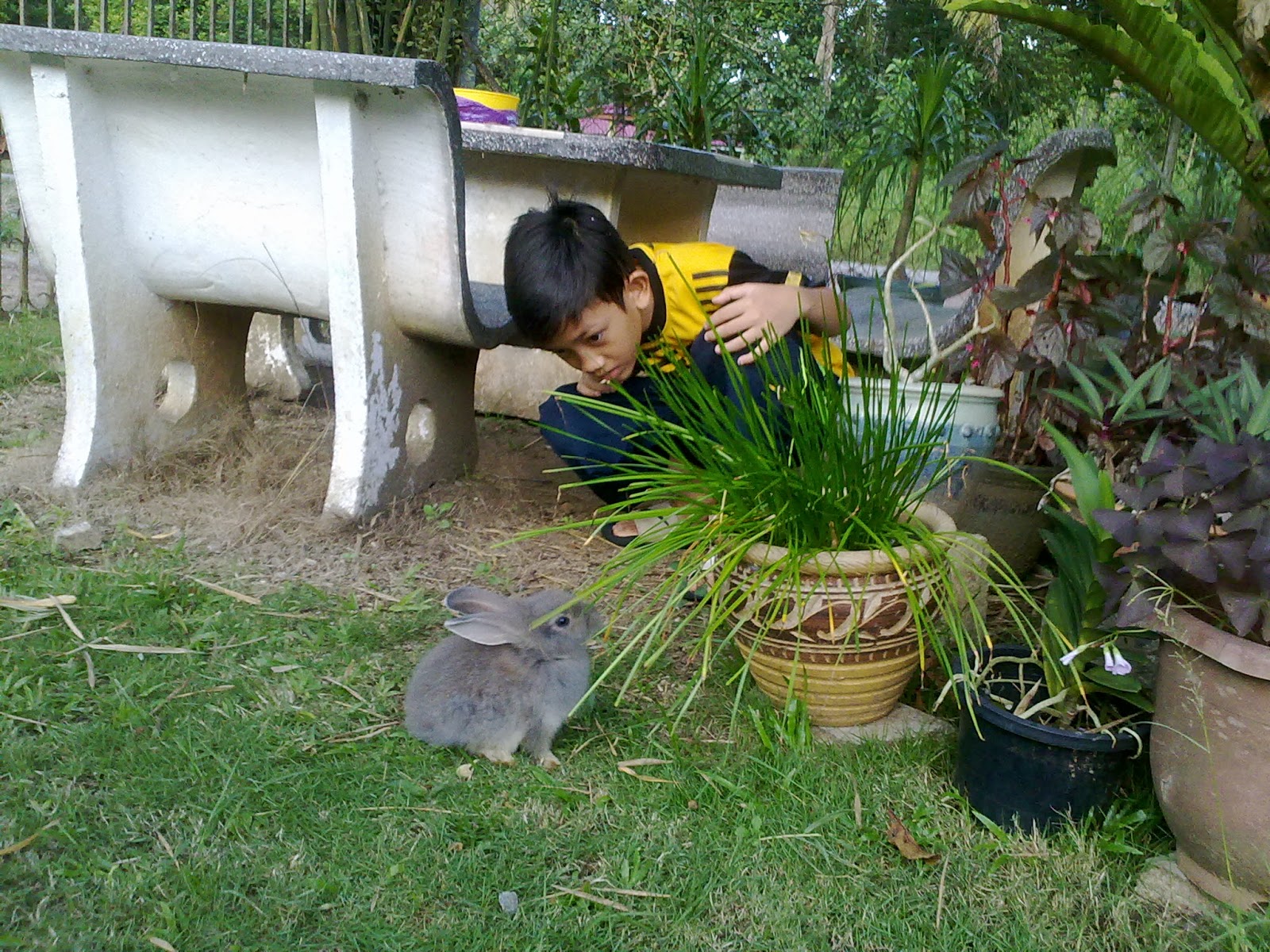 Nak story sikit lagi eh, bila sampai kat umah tadi terus aku tunaikan kewajipan aku dulu. Sujud dengan rasa rendah hati dan syukur kepada yang Esa, sebab bagi aku rezeki hari nih. Then, aku kuar cuci keta aku yang dah comot macam aku tue. Adeiiii...dah tak macam rupa keta aku nengok!! Dah settlekan semua, join adik yang kecik main ngan arnab. Hobi baru dia, petang-petang bawak arnab kuar main kat laman umah (bole tengok gambaq kat bawah). Arnab tue pon comot macam dia. . . Mama lak asyik bebel, arnab siap makan pokok bunga dia. haha. . . Aku cakap kat mama, "Dia tak makan abeh la pokok bunga ma tue. Tak luak aihhhh. . . nanti k.ngah beli banyak lagi, letak la satu laman nih. . .hahaha." Tue la mama, sayang sungguh dengan pokok bunga dia. Memang semua sihat-sihat. Macam-macam baja letak.